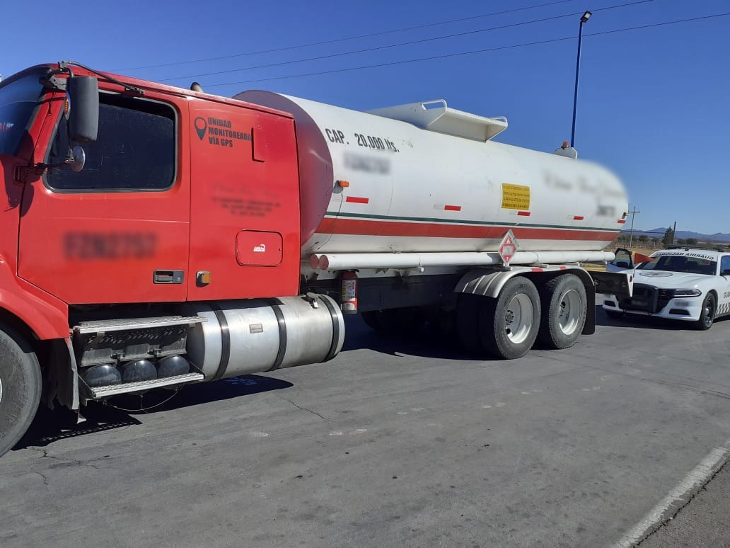 Sobre la carretera Chihuahua–Madera, tramo Chihuahua-Cuauhtémoc, efectivos federales interceptaron un camión tipo pipa para efectuar una inspección de seguridad. El conductor manifestó transportar combustible y presentó documentos con inconsistencias que no avalaban su legal procedencia y traslado.