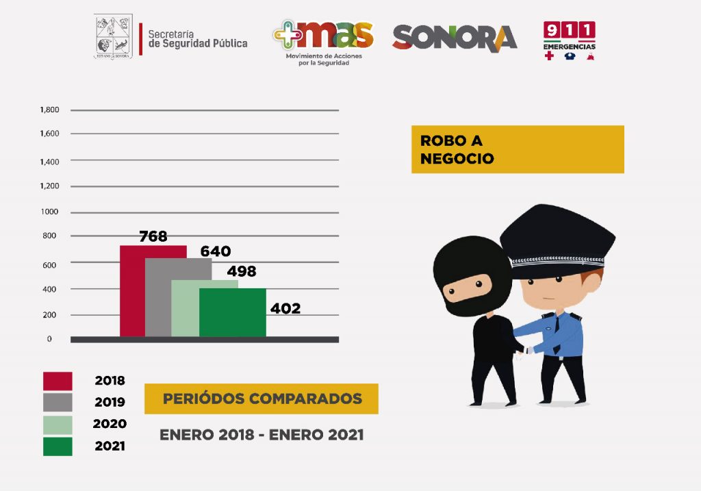 En cuanto al robo a negocio, la SSP también formó chats de MAS en Whatsapp con comerciantes y se logró un decremento significativo de 42.4%, siendo la media mensual este año de 402, mientras que el año anterior fue de 698.