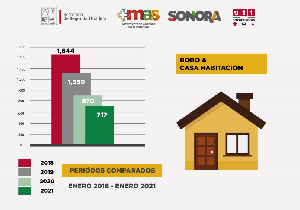 Esto ha generado que en el primer mes del año 2021 el robo a casa habitación bajara 37.2% en comparación con el año anterior, registrando una media mensual de 717 incidentes, mientras que en enero de 2020 fue de 1143.