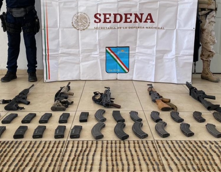 Al inspeccionar la zona, localizaron 5 armas largas, entre estas 2 de las conocidas como AR-15, calibre .223, 2 de las llamadas AK-47 y una más tipo fusil sin datos legibles, también incautaron más de mil cartuchos de diferentes calibres, así como una mochila que contenía 13 cargadores.
