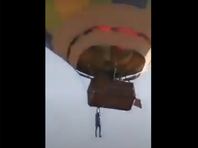 En el video se ve cómo el globo de la empresa Teotiballons está con la puerta de la canastilla abierta, mientras el individuo queda con los brazos extendidos y apenas puede sujetarse de la orilla del contenedor.