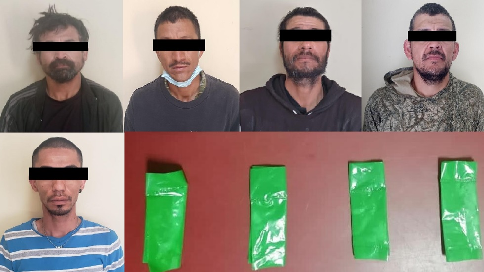 San Luis Río Colorado, Sonora. Oficiales de la Policía Estatal de Seguridad Pública (PESP) realizaron el aseguramiento de cinco personas por posesión de varios paquetes con sustancia similar a narcótico.