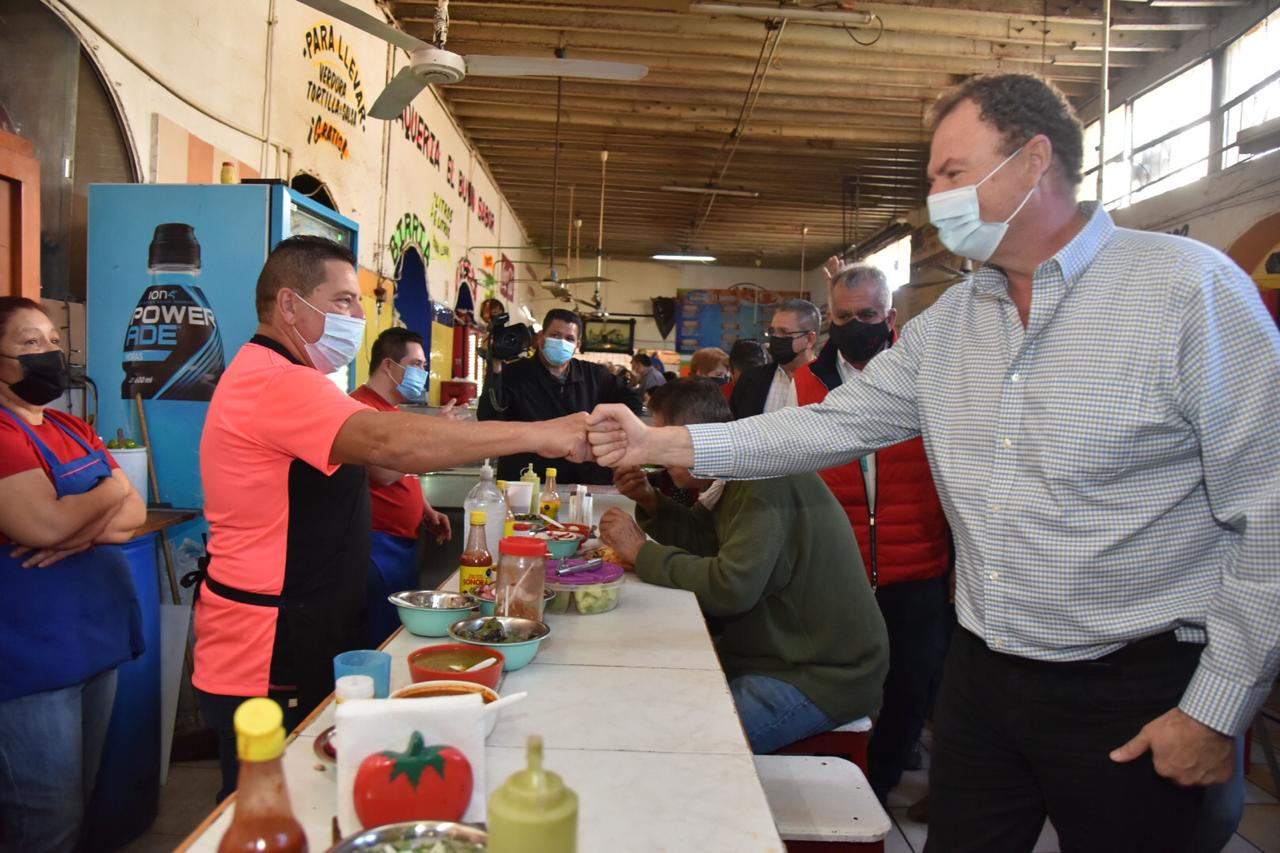 Guaymas, Son.- El candidato por la Alianza “Va Por Sonora”, Ernesto Gándara Camou, inició su visita a Guaymas con un recorrido por el sector comercial del primer cuadro de la ciudad, así como del interior del antiguo Mercado Municipal.
