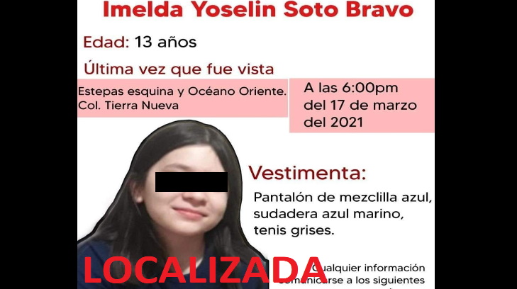 Hermosillo.- Imelda Yoselin Soto Bravo, la joven de 13 años reportada como desaparecida la tarde de ayer en la colonia Tierra Nueva, fue encontrada sana y salva.