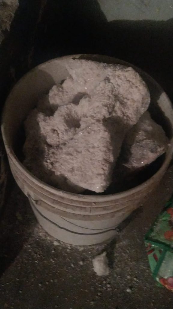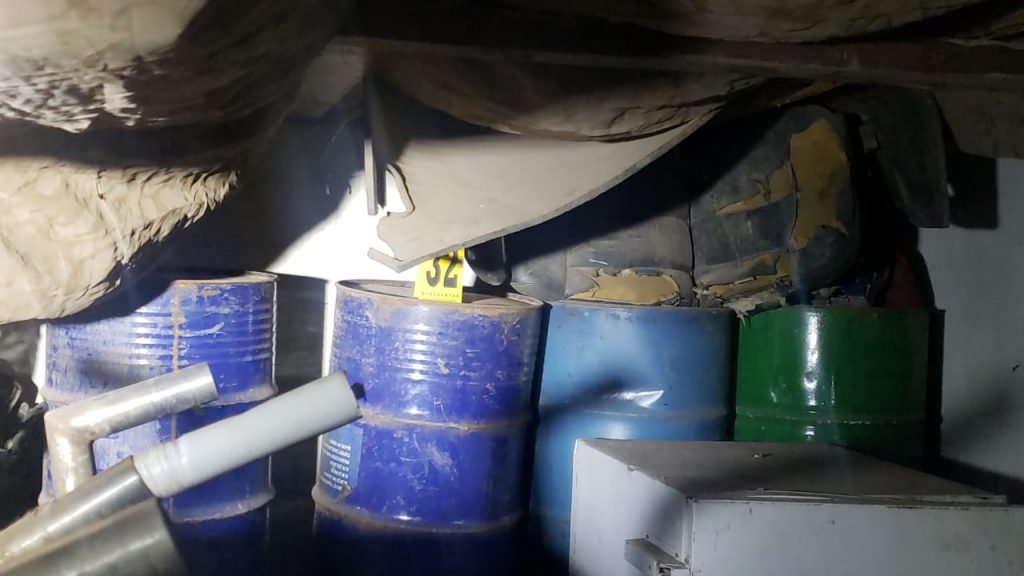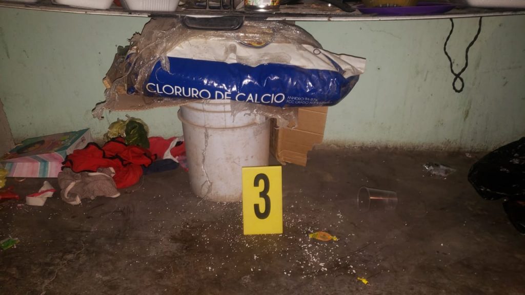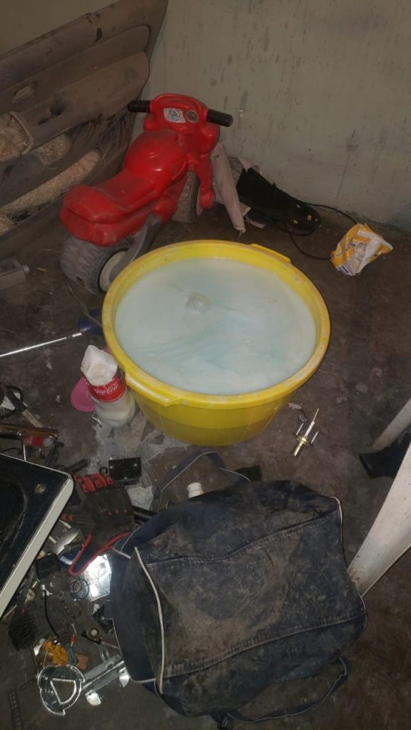 En el interior del inmueble fueron asegurados diversos productos químicos que presuntamente se utilizan para la elaboración de droga sintética como un costal con material de cloruro de calcio, una cubeta con una sustancia granulada de color blanco, una bolsa de plástico con polvo de color blanco, un contenedor metálico con polvo blanco, un recipiente con líquido de color negro, 4 termos y dos botellas con una sustancia granulada, tres recipientes con un líquido transparente y un recipiente con polvo blanco.