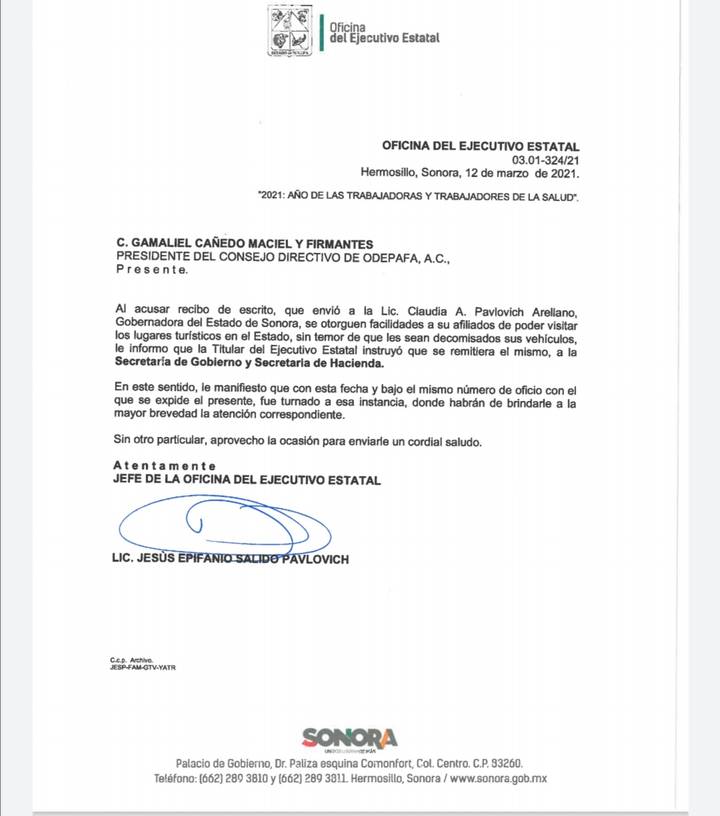 “Al acusar recibo de escrito, que envió a la Lic. Claudia Pavlovich Arellano, Gobernadora del Estado de Sonora, se otorguen facilidades a sus afiliados de poder visitar los lugares turísticos del estado, sin temor de que les sean decomisados sus vehículos, le informo que la titular del Ejecutivo Estatal instruyó que se remitiera el mismo a la Secretaría de Gobierno y Secretaría de Hacienda”, expone el oficio.