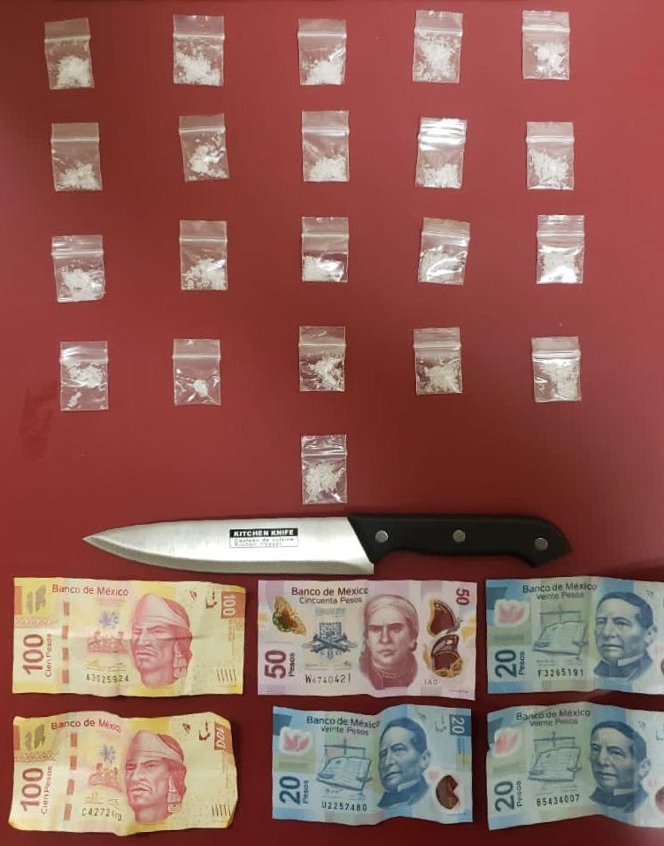 A través de una denuncia al número 089 por venta de droga en la colonia Burócrata, elementos de la PESP acudieron a la zona y sobre la avenida Álvaro Obregón vieron a un hombre que intentó escapar, por lo que lo aseguraron tras detectar que portaba un arma blanca tipo cuchillo y 21 bolsas con de sustancia similar a narcótico. Se identificó como Gary “N”, de 39 años de edad.