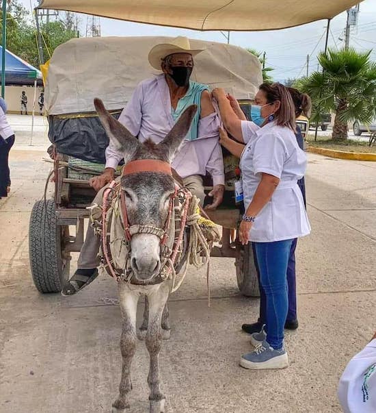Esta escena tuvo lugar en un módulo de vacunación Drive-Thru instalado en el municipio de Burgos, en el centro de Tamaulipas, hasta donde acudió Gonzalo Zúñiga, montado en un carretón que era jalado por un burro.