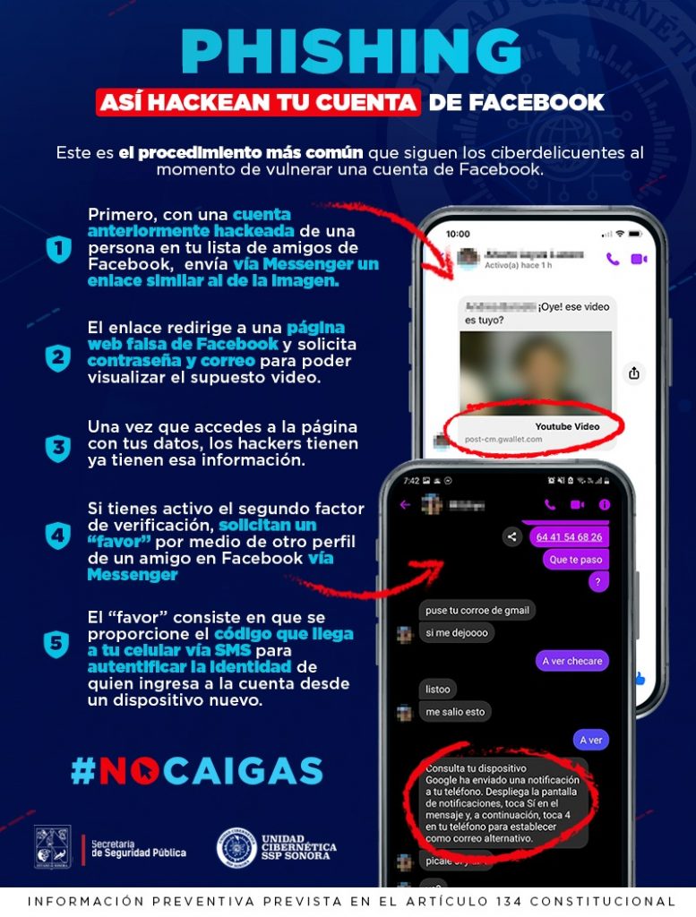Hermosillo, Sonora. Para evitar un posible hackeo de cuentas de Facebook, la Unidad Cibernética de la Secretaría de Seguridad Pública (SSP) recomienda evitar el ingreso a enlaces sospechosos enviados por un amigo y no proporcionar el código de seguridad que llega vía SMS.
