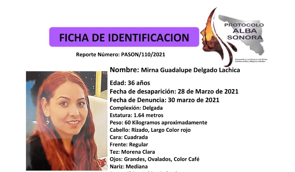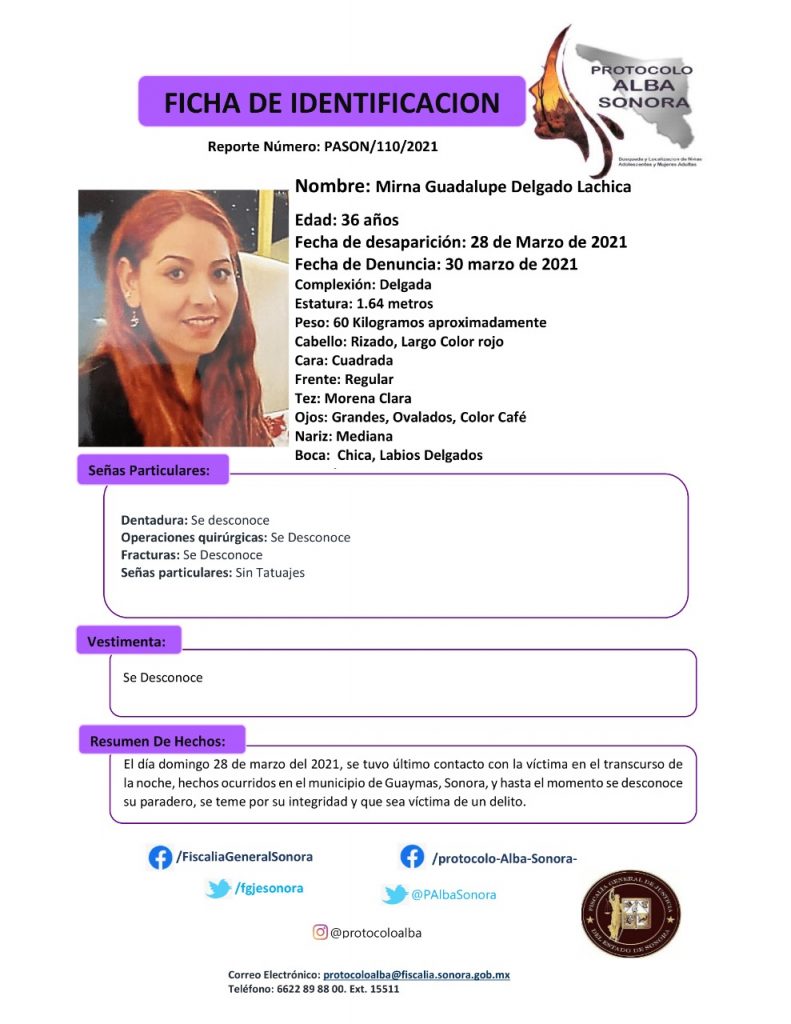 Ciudad Obregón Sonora. Este martes 30 de marzo, a las 11:50 horas, en el Centro de Atención Temprana de la FGJE en Cajeme, se recibió denuncia por desaparición de la joven Mirna Guadalupe Delgado Lachica, de 36 años de edad.