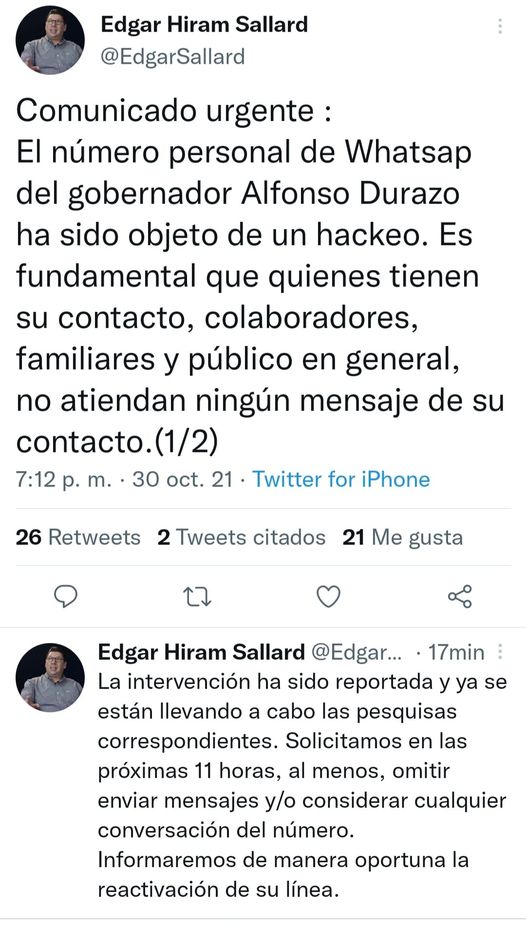 Hackean Whatsapp de gobernador de sonora, Alfonso Durazo