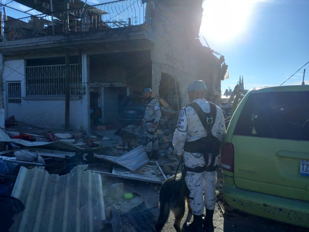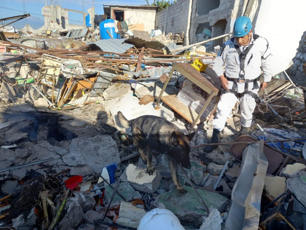 Para descartar la presencia de posibles víctimas atrapadas, binomios caninos de la Guardia Nacional (GN) realizan trabajos de búsqueda en las viviendas afectadas por la explosión en una toma clandestina de gas, en San Pablo Xochimehuacán, estado de Puebla.