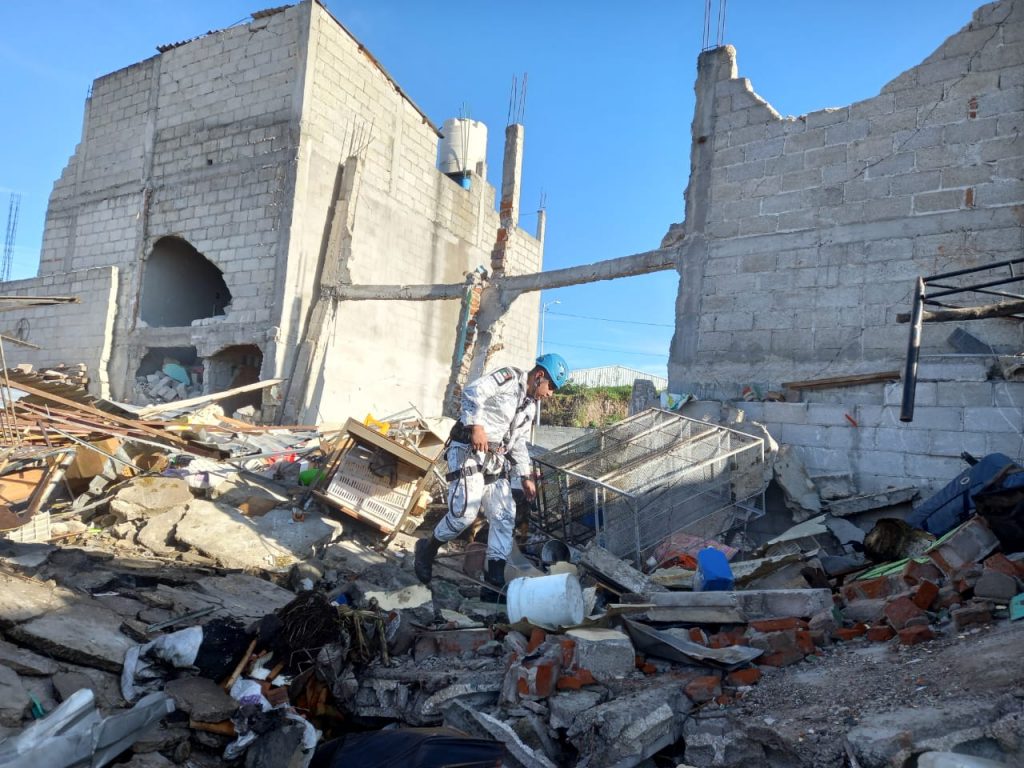 Los elementos especializados en búsqueda y rescate, en coordinación con autoridades de los tres órdenes de gobierno, continúan los recorridos en inmuebles colapsados tras el percance.