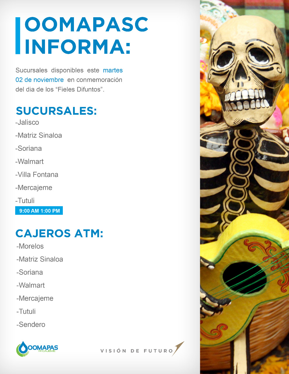 Personal de OOMAPAS de Cajeme te espera en sus sucursales de 09:00 de la mañana a 01:00 del medio día y en los cajeros automáticos 24 horas.