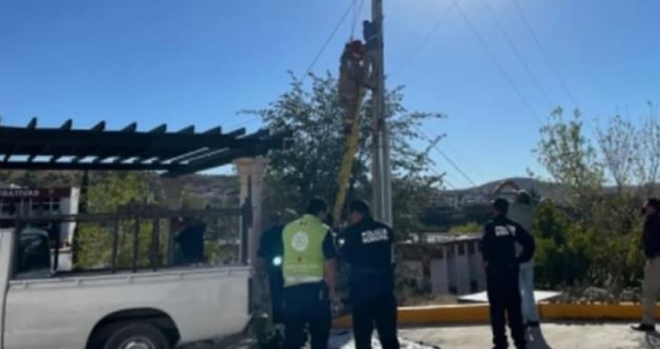 El joven trabajador fue bajado del poste mediante maniobras de rescatistas de Bomberos de Nogales y trasladado por paramédicos de Cruz Roja al Hospital del Seguro Social para su atención médica.