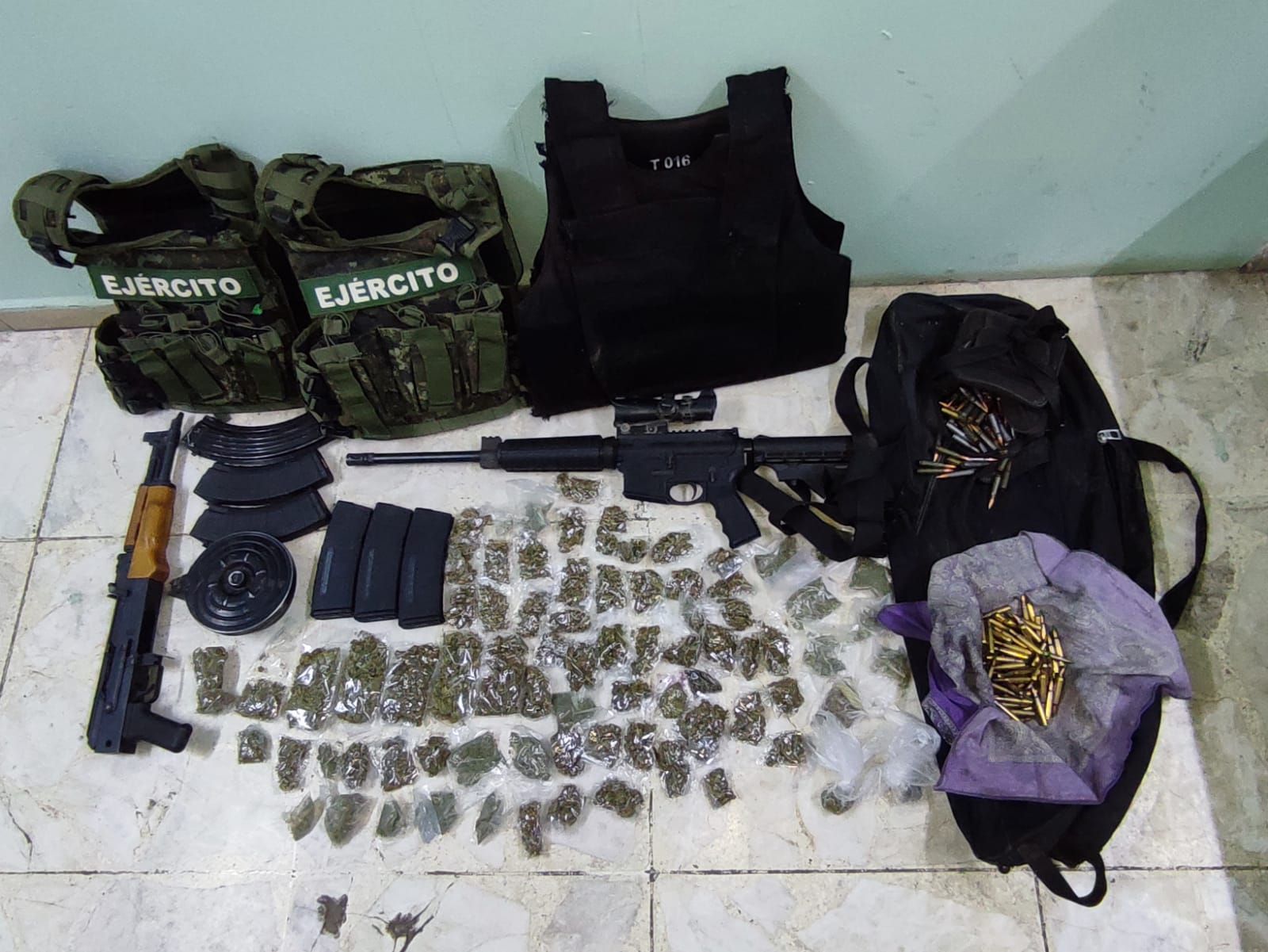 Por lo anterior, los elementos, procedieron de inmediato a una inspección encontrando dos armas de fuego largas, tres chalecos, 239 cartuchos útiles y más de 70 envoltorios de una hierva de color verde y seca con características similares a las de la marihuana.