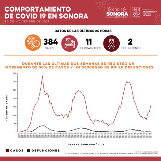 Mencionó que en las últimas 24 horas ocurrieron dos defunciones en un hombre y una mujer residentes de los municipios de Hermosillo y Cajeme; de estos pacientes, uno contaba con el esquema de vacunación completo contra SARS CoV-2, y la otra no estaba vacunada.