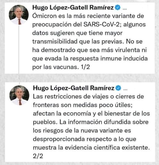 El subsecretario de Salud, Hugo López-Gatell tomó sus redes sociales para asegurar que cerrar las fronteras ante la nueva variante de covid-19 Ómicron es una medida “poco útil” y que no existe evidencia sobre riesgos altos por esta nueva variante.