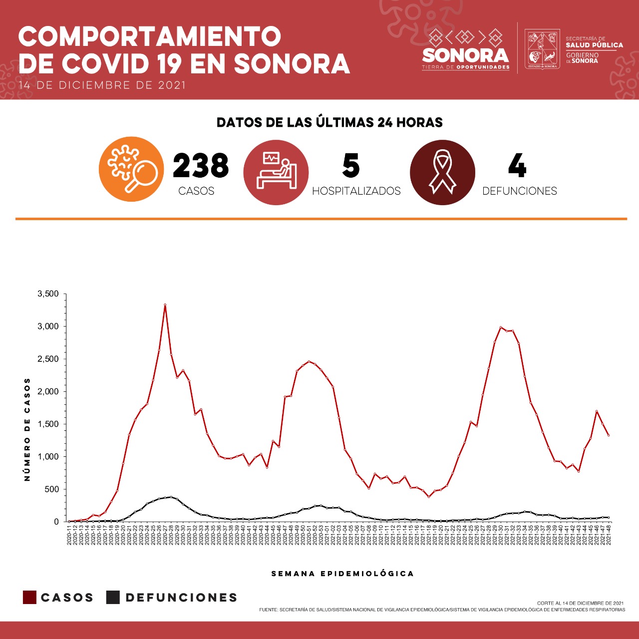 Hermosillo.- Este día la Secretaría de Salud de Sonora (SSA) confirmó 238 nuevos casos y cuatro defunciones por Covid-19.
