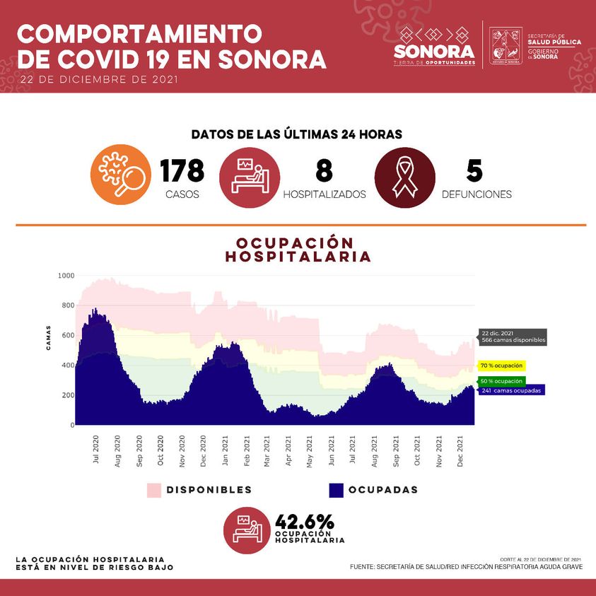 Hermosillo.- La Secretaría de Salud de Sonora (SSA), reportó este día 178 nuevos contagios y cinco defunciones por Covid-19.