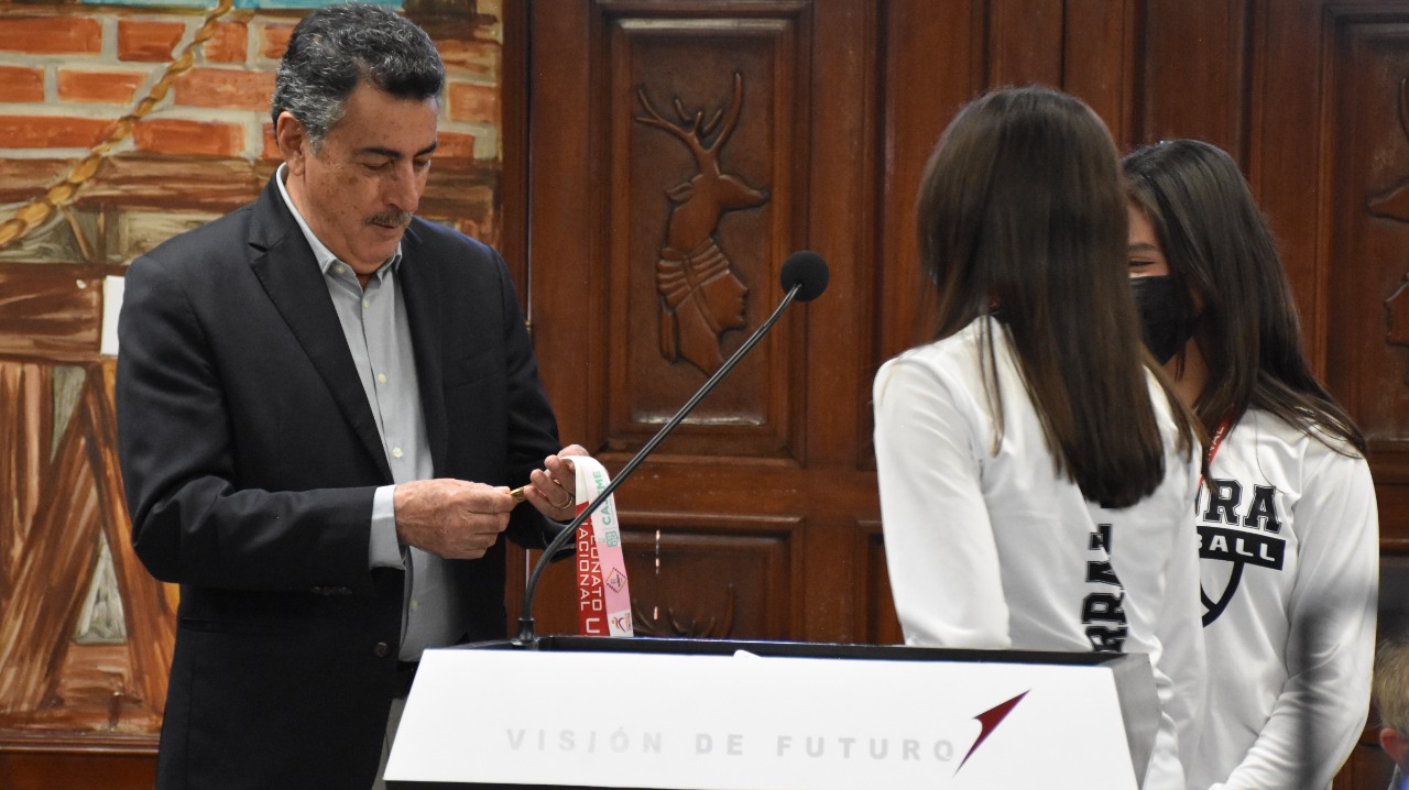 Por haber representado dignamente a Cajeme y hacerse acreedoras al segundo lugar a nivel nacional de la Liga Ademeba de Basquetbol Femenil, con sede en esta ciudad los días 10, 11 y 12 de diciembre pasado, el Alcalde Javier Lamarque Cano entregó un reconocimiento a Carolina Borbón Alvarado y Camila Corral Morales, de 14 años de edad y quienes pertenecen a la Selección Sonora.