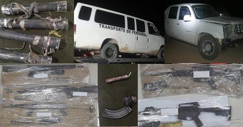 En su interior contenía, dos armas de fuego tipo fusil calibre .223mm, dos armas de fuego tipo fusil calibre 7.62x39mm, un arma de fuego calibre .308mm, 44 cargadores para arma de fuego de diversos calibres, 1,937 cartuchos útiles, una granada aturdidora, un objeto con mecha detonante (al parecer explosivo), cuatro tubos de pvc caseros (probablemente explosivos).
