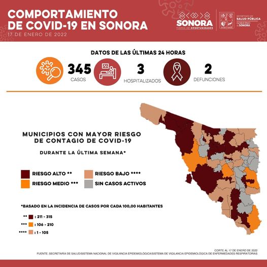 Hermosillo.- Este día la Secretaría de Salud de Sonora, (SSA) reportó 345 nuevos casos y dos defunciones por Covid-19.