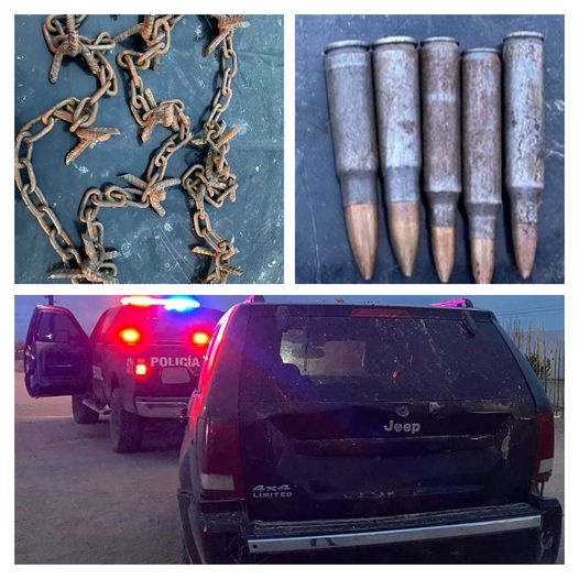 Caborca.- Oficiales de la Policía Estatal de Seguridad Pública (PESP) realizaron el hallazgo de un vehículo abandonado con cartuchos y una cadena con puntas.