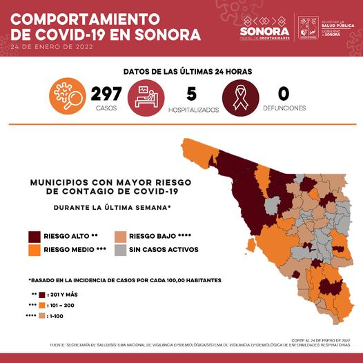Hermosillo.- Este día la Secretaría de Salud (SSA) reportó 297 casos y cero defunciones por Covid-19.