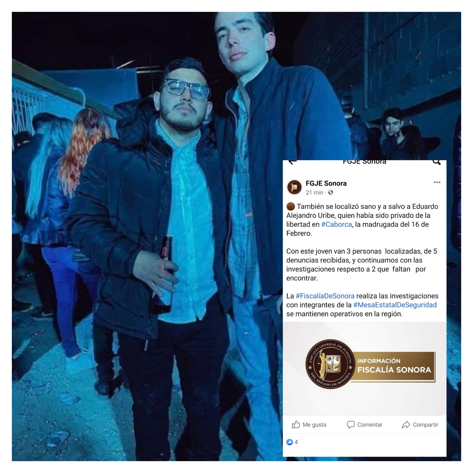 La Fiscalía General de Justicia del Estado (FGJE) dio a conocer que fue localizado sano y a salvo el joven Eduardo Alejandro Uribe, quien había sido privado de la libertad en Caborca el día de ayer junto a otros cuatro jóvenes.
