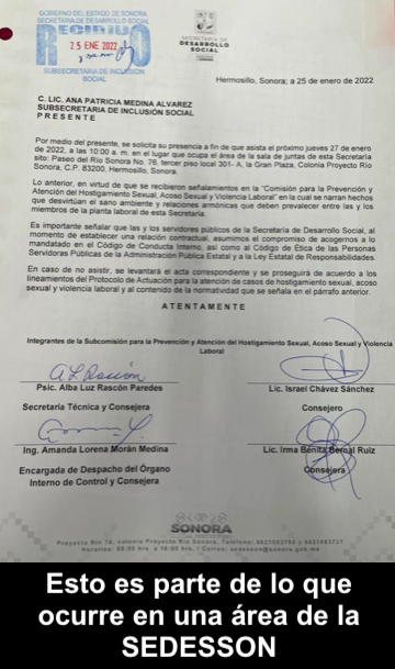 Pues la verdad es que nos declaramos totalmente sorprendidos, porque contrario a lo que se ha dicho, que la denunciada es la titular de la SEDESSON, pues no, las denuncias son en contra de la subsecretaria de Inclusión Social, Ana Patricia Medina Álvarez, tal como queda asentado en los registros de la Comisión para la Prevención y Atención del Hostigamiento Sexual, Acoso Sexual y Violencia Laboral en la Administración Pública, instancia que ya sigue los protocolos previstos para estos casos, que incluye sanciones y demás.