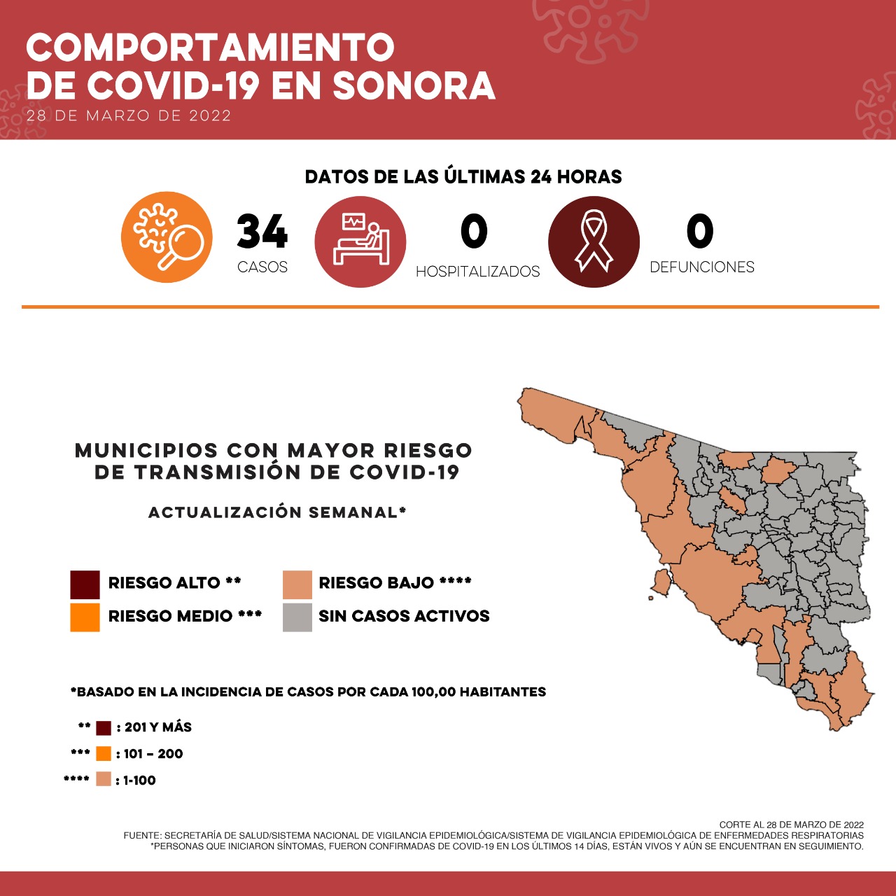 Hermosillo.- La Secretaría de Salud (SSA) confirmó 34 nuevos casos de Covid-19 y cero defunciones.