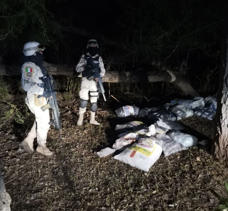En las inmediaciones de Agua Escondida, los elementos encontraron 11 costales que en su interior tenía bolsas con una sustancia granulosa, similar a la metanfetamina, con un peso bruto total de 200 kilogramos.