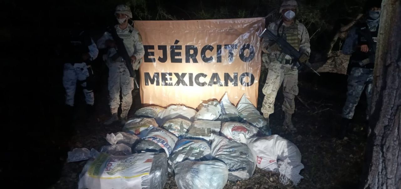 En las inmediaciones de Agua Escondida, los elementos encontraron 11 costales que en su interior tenía bolsas con una sustancia granulosa, similar a la metanfetamina, con un peso bruto total de 200 kilogramos.