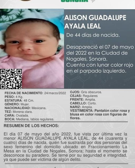 La Fiscalía de Sonora solicita la colaboración ciudadana para localizar a la bebé de 44 días de nacida, Alison Guadalupe, quien fue sustraída de su domicilio en la colonia La Mesa de Nogales, al parecer por dos personas del sexo femenino.