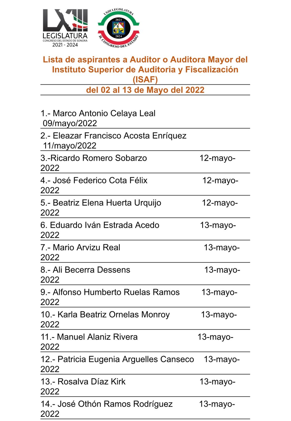 Hermosillo.- En cumplimiento a la Base Cuarta de la Convocatoria Pública para designar a la o el ciudadano que habrá de ocupar el cargo de Auditor Mayor del Instituto Superior de Auditoría y Fiscalización, el Congreso del Estado informa que se registraron 14 aspirantes.