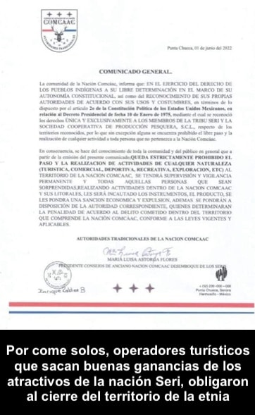 “Punta Chueca e Isla Tiburón, Hermosillo, Sonora, México a 06 de junio de 2022.- El presente comunicado es a titulo personal en mi carácter de uno de las cinco autoridades del pueblo Comcaac