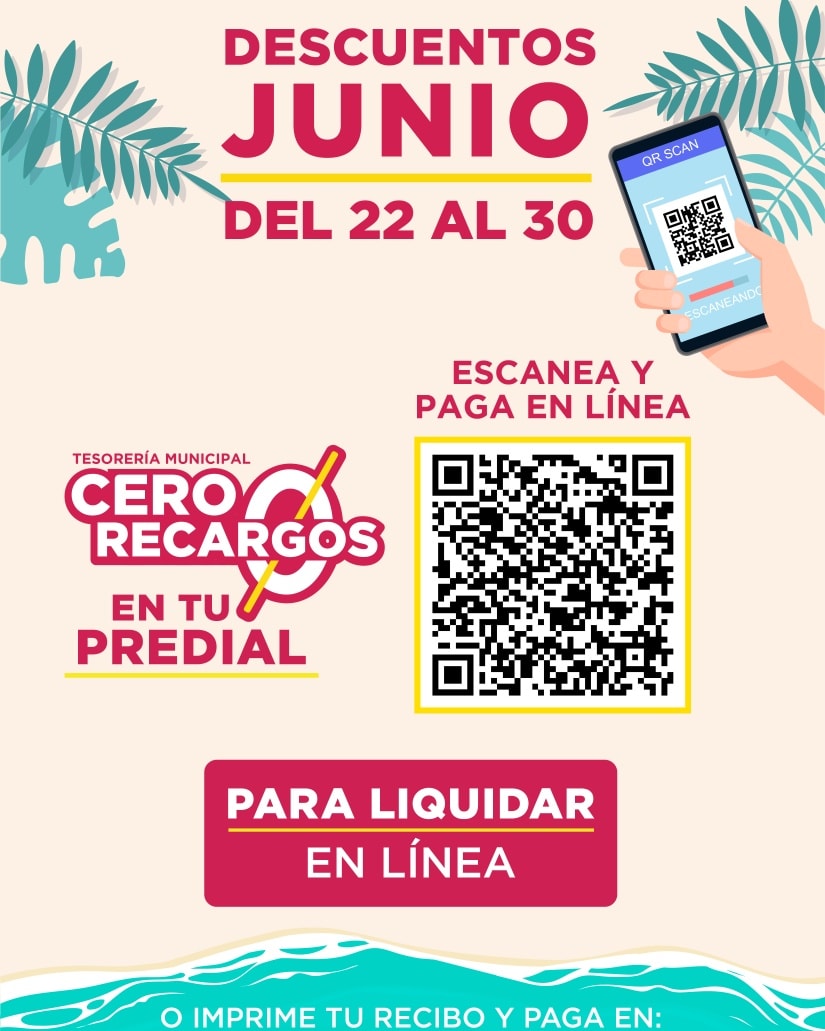 Aprovecha los descuentos que Tesorería Municipal tiene para ti desde hoy al 30 de junio. Prediales, multas de tránsito y multas fiscales con importantes descuentos y cero recargos.