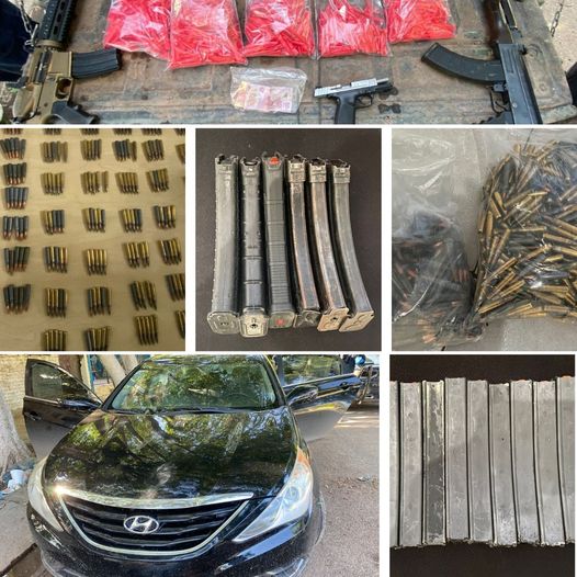 Los hechos tuvieron lugar en la calle General Plutarco Elías Calles de la colonia Benito Juárez, donde les aseguraron un vehículo Hyundai, Sonara, con tres armas de fuego, entre estas una AK-47, una pistola calibre .9mm y otra 5.56 con más de 70 cartuchos y cargadores.