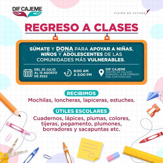 🤗 Estamos recibiendo donaciones de útiles escolares para apoyar a niñas, niños y adolescentes de las comunidades más vulnerables del municipio, puedes participar con: mochilas, lapiceras, loncheras, estuches, lápices, plumas, colores, borradores, sacapuntas, cuadernos, etc.