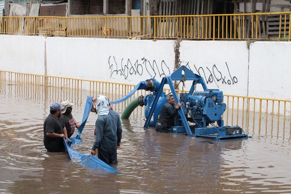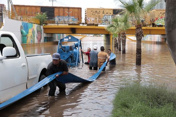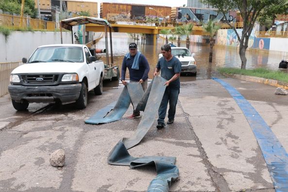 Tras las fuertes rachas de viento y la lluvia registrada durante la noche del viernes, personal de Servicios Públicos del Ayuntamiento Municipal trabaja en acciones de desfogue del paso a desnivel de la calle 200.