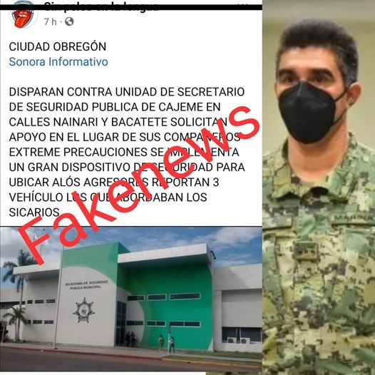 CAJEME.- Luego de que circulará en las redes sociales información donde se mencionaba un presunto ataque armado en contra de la unidad del Jefe de la Policía y Tránsito Municipal, Claudio Cruz Hernández, la SSPM informa que dicha información es totalmente falsa. En caso de cualquier eventualidad se informará a través de los medios oficiales.