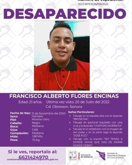 La Comisión de Búsqueda de Personas Para el Estado de Sonora informó que el joven FRANCISCO ALBERTO FLORES ENCINAS de 21 años de edad desapareció el 20 de julio de este año en Ciudad Obregón, Sonora.