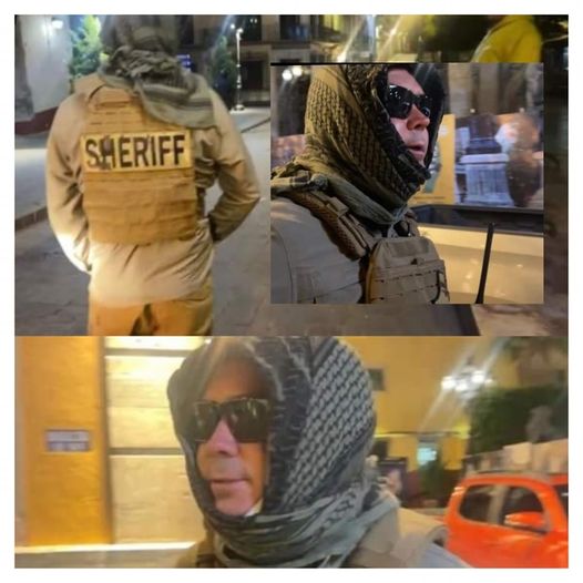 En fotos difundidas en redes sociales, Navarro se observa con ropa color caqui, un chaleco antibalas que dice “Sheriff”, un pañuelo palestino (kufiyya) alrededor de la cabeza y lentes oscuros.