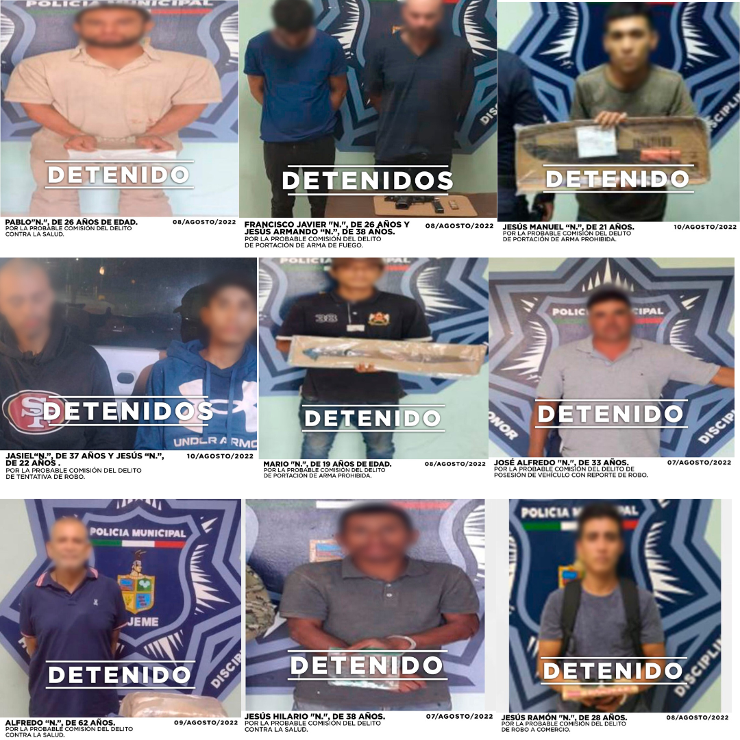 Algunos de los detenidos fueron Jesús Hilario “N.”, de 38 años, por el presunto delito contra la salud; José Alfredo “N.”, de 33 años y Francisco Javier “N.”, por la presunta comisión del delito de posesión de vehículo con reporte de robo; Mario “N.”, de 19 años, por la probable comisión del delito de posesión de arma prohibida; Pablo “N.”, de 26 años, por la presunta comisión del delito contra la salud; Jesús Ramón “N.”, de 28 años de edad, por la presunta comisión de delito de robo a comercio; Francisco Javier “N.”, de 26 años y Jesús Armando “N.”, de 38 años, por la presunta comisión del delito de portación de arma de fuego; Alfredo “N.”, de 62 años, por la presunta comisión del delito contra la salud; Jesús Manuel “N.”, de 21 años, por el presunto delito de portación de arma prohibida; Jasiel “N.”, de 37 años de edad y Jesús “N.”, de 22 años de edad, por la presunta comisión del delito de tentativa de robo; entre otros.