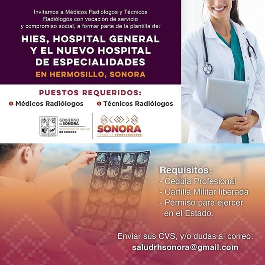 Detalló que se están solicitando médicos radiólogos, técnicos en radiología y un especialista en archivo. Aquellas o aquellos interesados en acceder a la convocatoria, necesitan contar con currículum vitae, documentación que demuestre su profesión (permiso para ejercer, titulo y cédula profesional) y, en caso de los hombres, cartilla militar liberada. Los documentos deberán ser adjuntados y enviados al correo saludrhsonora@gmail.com.