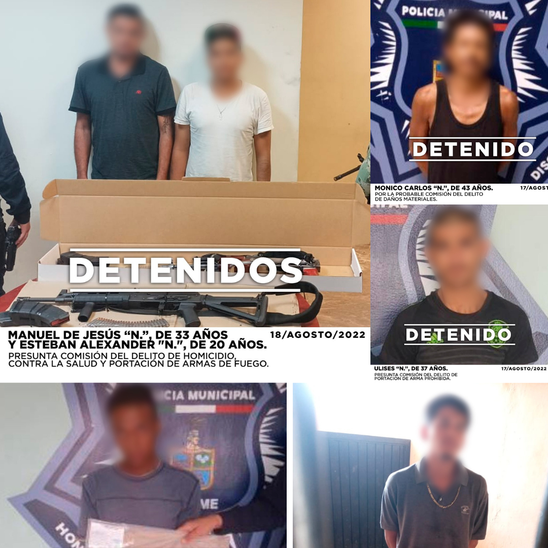 Algunos de los detenidos fueron César Alexis “N.”, de 24 años, por la presunta comisión del delito contra la salud; Ulises “N.”, de 37 años, por la presunta comisión del delito de portación de arma prohibida; Monico Carlos “N.”, de 43 años, por la presunta comisión del delito de daños materiales; Manuel de Jesús “N.”, de 33 años y Esteban Alexander “N.”, de 20 años, por la presunta comisión del delito de homicidio, contra la salud y portación de armas de fuego; entre otros.