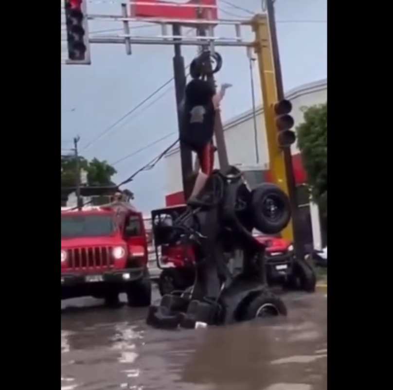 En redes sociales se viralizó imágenes captadas, en el cruce de la avenida Xicoténcatl y la calle Rafael Buelna, en la colonia las Quintas, en la capital del estado, en donde un joven a bordo de un cuatrimoto, hace piruetas y nada un tramo en una zona inundada por la tormenta de rápida formación que azotó el martes pasado.