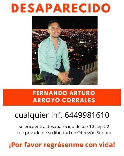 Desesperada se encuentra la familia del joven Fernando Arturo Arroyo Corrales, quien este sábado fue sacado a la fuerza de su centro de trabajo en Ciudad Obregón por varias personas armadas.
