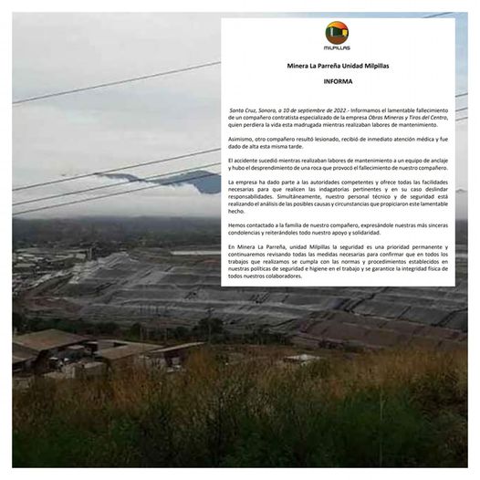 La empresa Minera La Parreña Unidad Milpillas envió a Despierta Sonora un comunicado confirmando el lamentable deceso de un trabajador y otro más que resultó lesionado en el municipio de Santa Cruz, Sonora, aunque aclaró que esto ocurrió cuando hubo el desprendimiento de una roca y no por derrumbe.